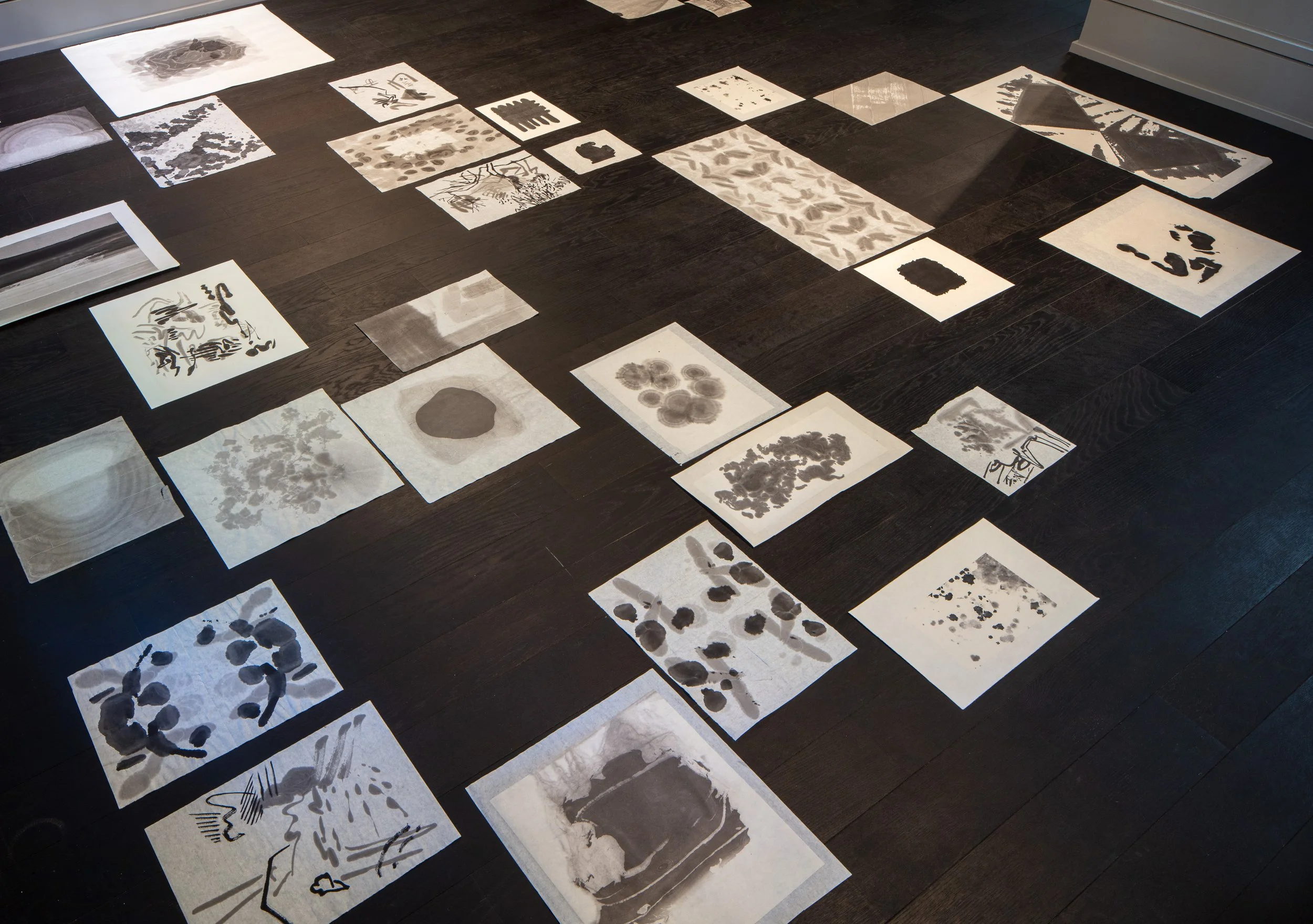 In China, painting takes place perpendicularly to its European counterpart, flat on the ground instead of standing on an easel. The qualities of the paper are of great importance, and the work is not considered complete until it is mounted on thicker paper or on elaborate silk-embroideries. Paintings tend to be rolled rather than hung, or are kept in drawers. Viewing means handling them with careful fingers, images and narratives revealed in the literal unfurling of long scrolls. There is a history of Chinese painting that has little or nothing to do with European art, and which Egil had no knowledge of at all: it was even hard for him to say which works were recent and which were five hundred or a thousand years old. The Chinese ink that a friend introduced him to acted differently to anything he knew, the paper worked on wet and each brushmark forming a quick barrier at its edges, resisting rather than blending with the marks around it. This is the ink that was used to make Beijing Diaries, a series of around 60 works that each document the artist’s impression - literal or abstract - of another day in Beijing. For Studies and Exercises, these Diaries are presented alongside a landscape garden of preparatory studies in Chinese ink, placed like paving stones on the floor, where you can see the artist trying to work out the physical and technical qualities of the medium.